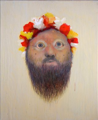 Ihre Ausbildung zur Bauzeichnerin kann (und will) Kiewit in ihren überwiegend großformatigen Mischtechniken nicht leugnen. Kuben und Kreise, explosionsartige Farbausbrüche, aber auch schwarze Formen, die aus der Industrie stammen könnten, auf weißem Grund vereinen sich zu informellen Situationen, denen die Künstlerin keine Titel gibt. Dagegen wirken Jun Ho Chos Bilder auf den ersten Blick, als erzähle er malerisch Geschichten. Tatsächlich sind es häufig Hasen, die er in irreale Situationen installiert. „Schön“ oder „lustig“ sind diese Situationen aber nicht – bei genauerem Hinsehen erzählen die Bilder von Hilflosigkeit (in einer Situation, in der ein Reporter einen Hasen-Maler interviewen will), von Erstaunen und Frustration (wenn der Porträtierte voller Tattoos in einem Sessel aus Sand zu versinken scheint) oder von düsterer Bedrohlichkeit (wenn ein Papphut tragender Erwachsener mit einem Kind in einer überdimensionalen Tasse Karussell fährt).